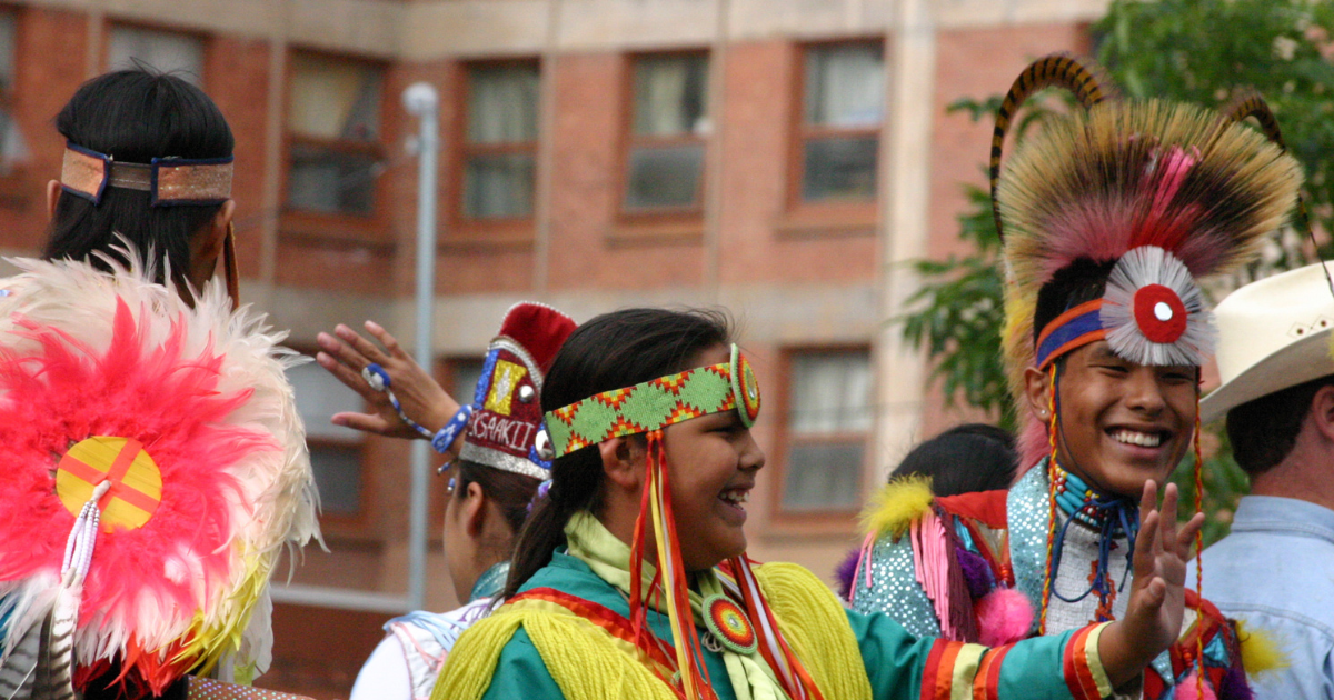 Indigenous peoples celebrating together through sing and dance.